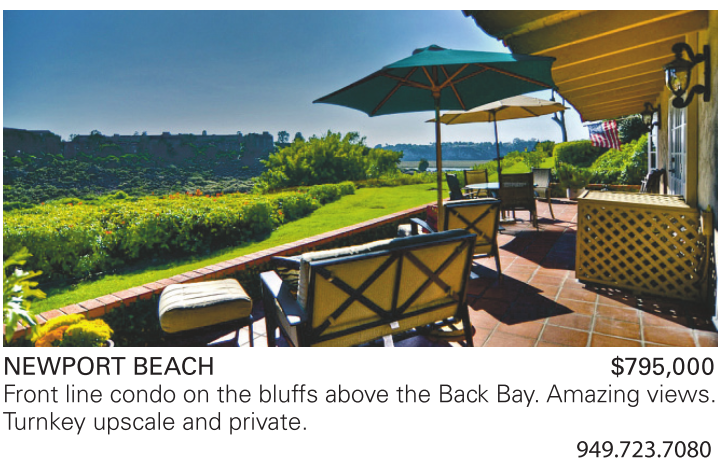 NEWPORT BEACH $795,000 Front line condo on the bluffs above the Back Bay. Amazing views. Turnkey upscale and private.