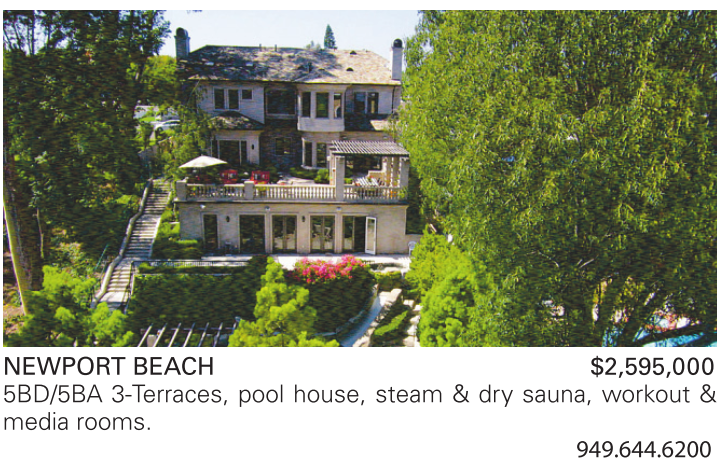 NEWPORT BEACH $2,595,000 5BD/5BA 3-Terraces, pool house, steam & dry sauna, workout & media rooms.
