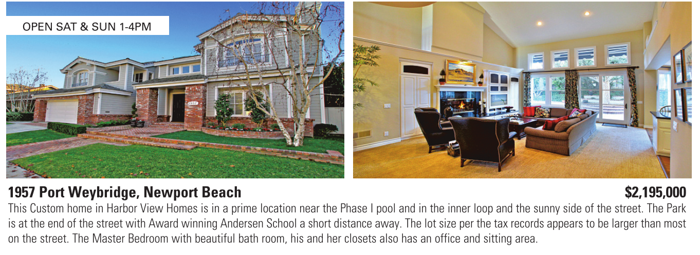 1957 Port Weybridge, Newport Beach $2,195,000 This Custom home in Harbor View Homes is in a prime location near the Phase I pool and in the inner loop and the sunny side of the street. The Park is at the end of the street with Award winning Andersen School a short distance away. The lot size per the tax records appears to be larger than most on the street. The Master Bedroom with beautiful bath room, his and her closets also has an office and sitting area.