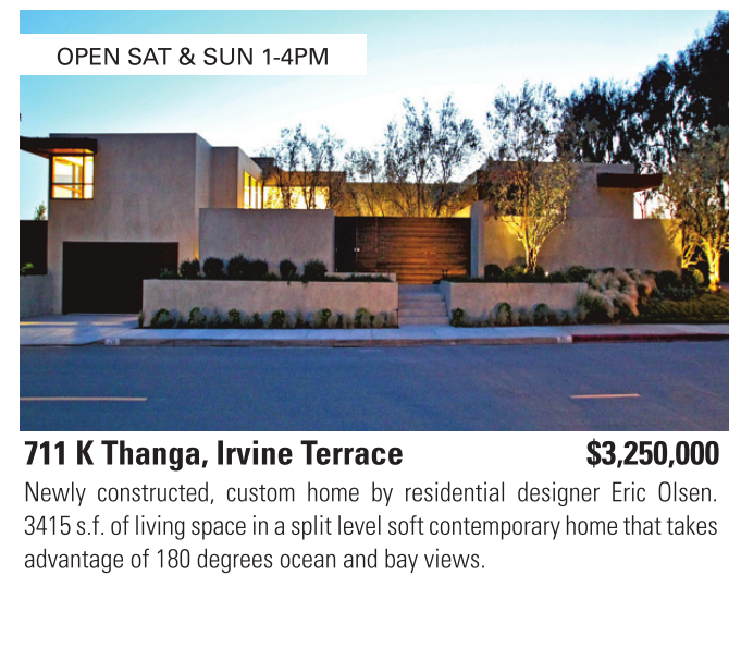 711 K Thanga, Irvine Terrace $3,250,000 Newly constructed, custom home by residential designer Eric Olsen. 3415 s.f. of living space in a split level soft contemporary home that takes advantage of 180 degrees ocean and bay views.