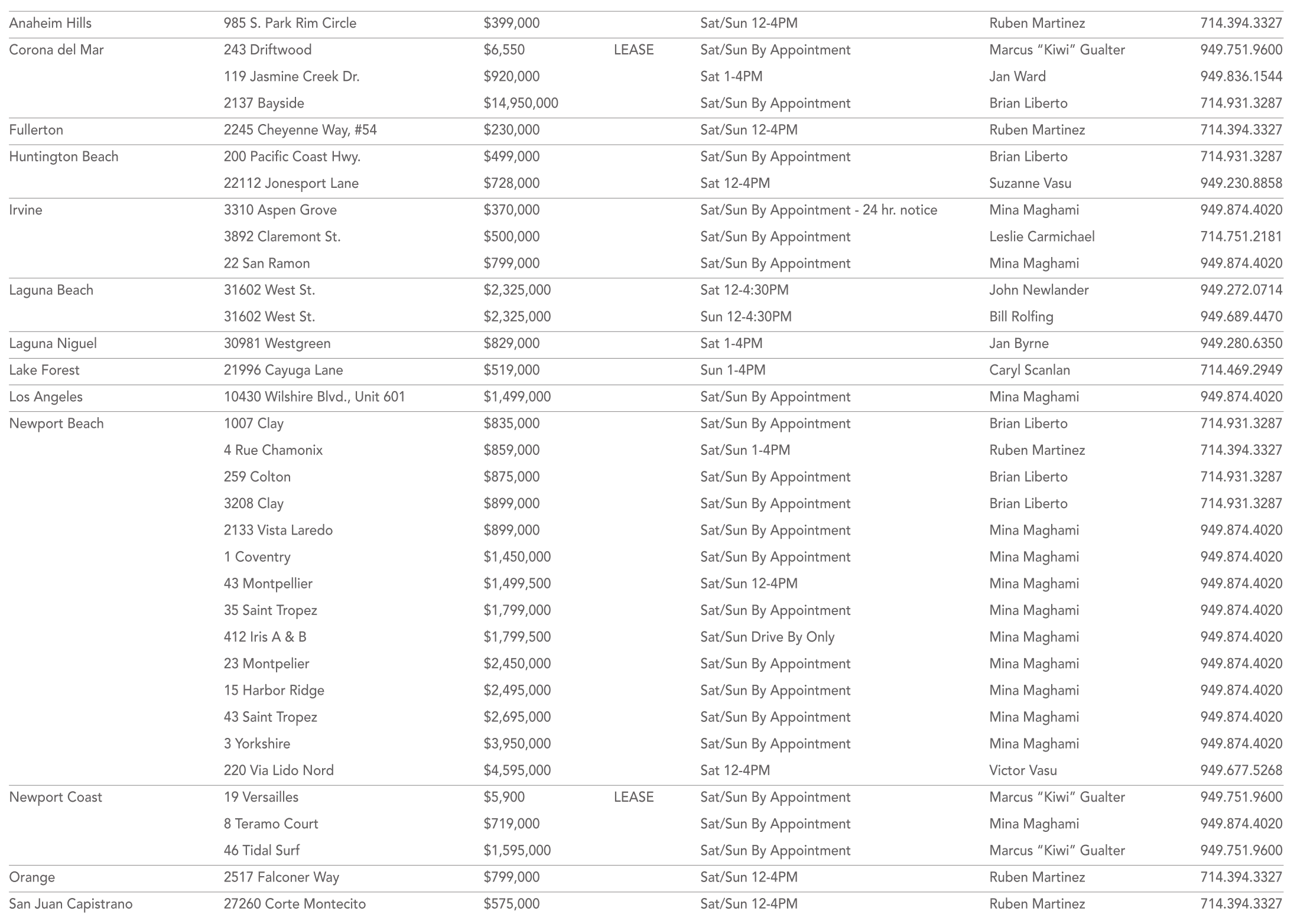 Anaheim Hills 985 S. Park Rim Circle $399,000 Sat/Sun 12-4PM Ruben Martinez 714.394.3327 Corona del Mar 243 Driftwood $6,550 LEASE Sat/Sun By Appointment Marcus “Kiwi” Gualter 949.751.9600 119 Jasmine Creek Dr. $920,000 Sat 1-4PM Jan Ward 949.836.1544 2137 Bayside $14,950,000 Sat/Sun By Appointment Brian Liberto 714.931.3287 Fullerton 2245 Cheyenne Way, #54 $230,000 Sat/Sun 12-4PM Ruben Martinez 714.394.3327 Huntington Beach 200 Pacific Coast Hwy. $499,000 Sat/Sun By Appointment Brian Liberto 714.931.3287 22112 Jonesport Lane $728,000 Sat 12-4PM Suzanne Vasu 949.230.8858 Irvine 3310 Aspen Grove $370,000 Sat/Sun By Appointment - 24 hr. notice Mina Maghami 949.874.4020 3892 Claremont St. $500,000 Sat/Sun By Appointment Leslie Carmichael 714.751.2181 22 San Ramon $799,000 Sat/Sun By Appointment Mina Maghami 949.874.4020 Laguna Beach 31602 West St. $2,325,000 Sat 12-4:30PM John Newlander 949.272.0714 31602 West St. $2,325,000 Sun 12-4:30PM Bill Rolfing 949.689.4470 Laguna Niguel 30981 Westgreen $829,000 Sat 1-4PM Jan Byrne 949.280.6350 Lake Forest 21996 Cayuga Lane $519,000 Sun 1-4PM Caryl Scanlan 714.469.2949 Los Angeles 10430 Wilshire Blvd., Unit 601 $1,499,000 Sat/Sun By Appointment Mina Maghami 949.874.4020 Newport Beach 1007 Clay $835,000 Sat/Sun By Appointment Brian Liberto 714.931.3287 4 Rue Chamonix $859,000 Sat/Sun 1-4PM Ruben Martinez 714.394.3327 259 Colton $875,000 Sat/Sun By Appointment Brian Liberto 714.931.3287 3208 Clay $899,000 Sat/Sun By Appointment Brian Liberto 714.931.3287 2133 Vista Laredo $899,000 Sat/Sun By Appointment Mina Maghami 949.874.4020 1 Coventry $1,450,000 Sat/Sun By Appointment Mina Maghami 949.874.4020 43 Montpellier $1,499,500 Sat/Sun 12-4PM Mina Maghami 949.874.4020 35 Saint Tropez $1,799,000 Sat/Sun By Appointment Mina Maghami 949.874.4020 412 Iris A & B $1,799,500 Sat/Sun Drive By Only Mina Maghami 949.874.4020 23 Montpelier $2,450,000 Sat/Sun By Appointment Mina Maghami 949.874.4020 15 Harbor Ridge $2,495,000 Sat/Sun By Appointment Mina Maghami 949.874.4020 43 Saint Tropez $2,695,000 Sat/Sun By Appointment Mina Maghami 949.874.4020 3 Yorkshire $3,950,000 Sat/Sun By Appointment Mina Maghami 949.874.4020 220 Via Lido Nord $4,595,000 Sat 12-4PM Victor Vasu 949.677.5268 Newport Coast 19 Versailles $5,900 LEASE Sat/Sun By Appointment Marcus “Kiwi” Gualter 949.751.9600 8 Teramo Court $719,000 Sat/Sun By Appointment Mina Maghami 949.874.4020 46 Tidal Surf $1,595,000 Sat/Sun By Appointment Marcus “Kiwi” Gualter 949.751.9600 Orange 2517 Falconer Way $799,000 Sat/Sun 12-4PM Ruben Martinez 714.394.3327 San Juan Capistrano 27260 Corte Montecito $575,000 Sat/Sun 12-4PM Ruben Martinez 714.394.3327