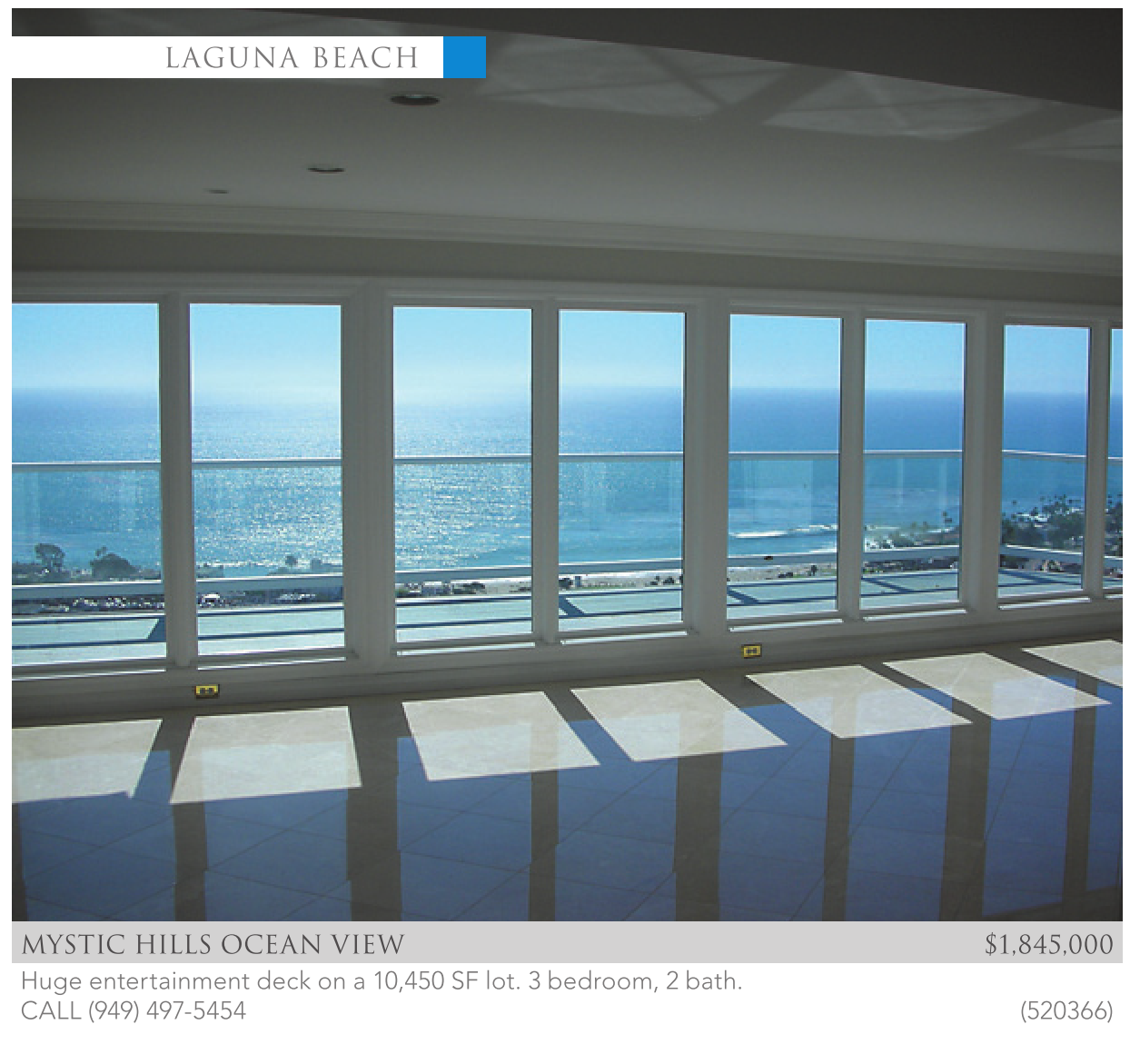 MYSTIC HILLS OCEAN VIEW $1,845,000 Huge entertainment deck on a 10,450 SF lot. 3 bedroom, 2 bath. CALL (949) 497-5454 (520366)
