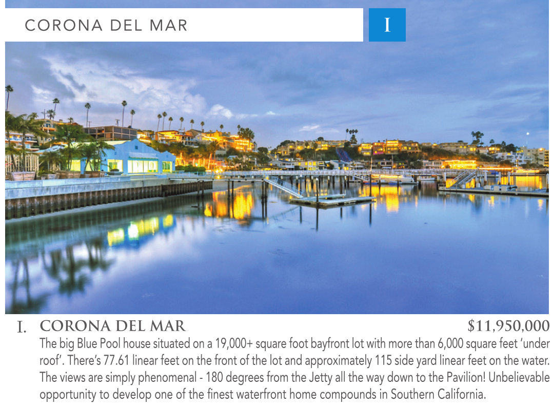 CORONA DEL MAR $11,950,000 The big Blue Pool house situated on a 19,000+ square foot bayfront lot with more than 6,000 square feet ‘under roof’. There’s 77.61 linear feet on the front of the lot and approximately 115 side yard linear feet on the water. The views are simply phenomenal - 180 degrees from the Jetty all the way down to the Pavilion! Unbelievable opportunity to develop one of the finest waterfront home compounds in Southern California.
