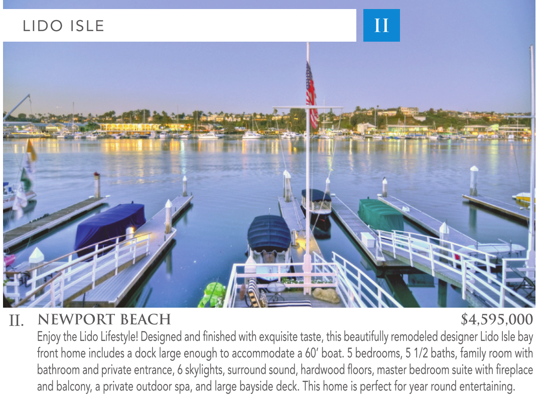 NEWPORT BEACH $4,595,000 Enjoy the Lido Lifestyle! Designed and finished with exquisite taste, this beautifully remodeled designer Lido Isle bay front home includes a dock large enough to accommodate a 60’ boat. 5 bedrooms, 5 1/2 baths, family room with bathroom and private entrance, 6 skylights, surround sound, hardwood floors, master bedroom suite with fireplace and balcony, a private outdoor spa, and large bayside deck. This home is perfect for year round entertaining.