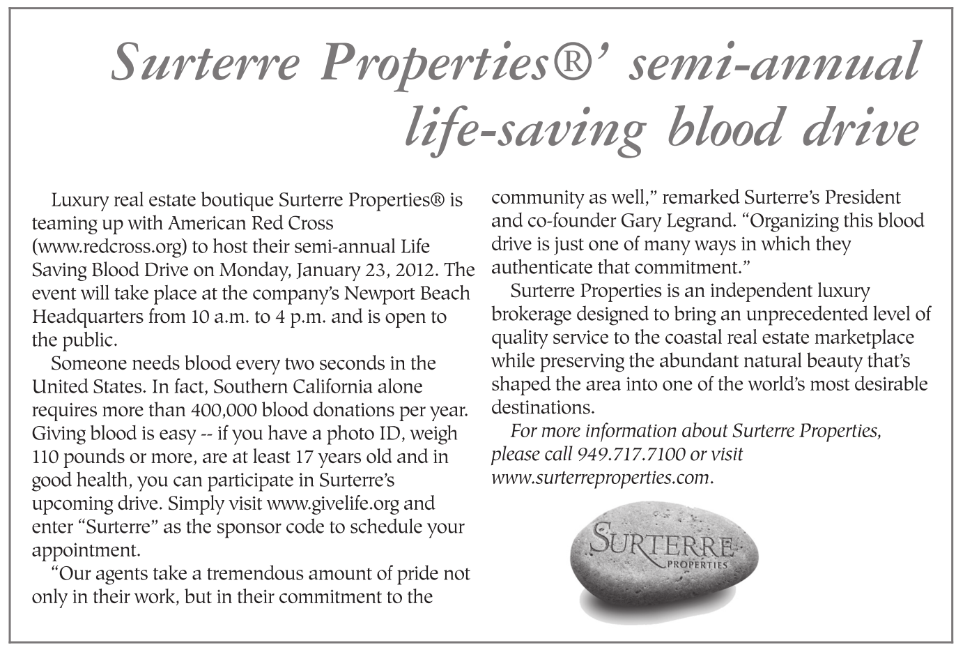 Surterre Properties®’ semi-annual life-saving blood drive Luxury real estate boutique Surterre Properties® is teaming up with American Red Cross (www.redcross.org) to host their semi-annual Life Saving Blood Drive on Monday, January 23, 2012. The event will take place at the company’s Newport Beach Headquarters from 10 a.m. to 4 p.m. and is open to the public. Someone needs blood every two seconds in the United States. In fact, Southern California alone requires more than 400,000 blood donations per year. Giving blood is easy -- if you have a photo ID, weigh 110 pounds or more, are at least 17 years old and in good health, you can participate in Surterre’s upcoming drive. Simply visit www.givelife.org and enter “Surterre” as the sponsor code to schedule your appointment. “Our agents take a tremendous amount of pride not only in their work, but in their commitment to the community as well,” remarked Surterre’s President and co-founder Gary Legrand. “Organizing this blood drive is just one of many ways in which they authenticate that commitment.” Surterre Properties is an independent luxury brokerage designed to bring an unprecedented level of quality service to the coastal real estate marketplace while preserving the abundant natural beauty that’s shaped the area into one of the world’s most desirable destinations. For more information about Surterre Properties, please call 949.717.7100 or visit www.surterreproperties.com.