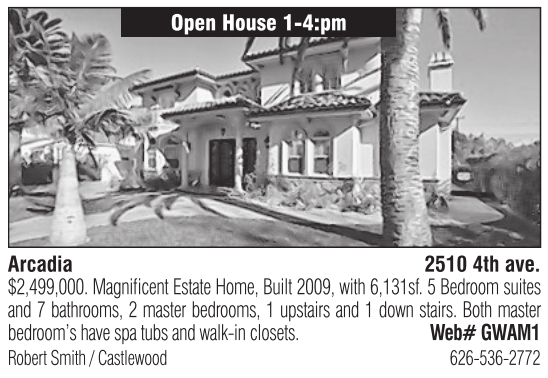 $2,499,000. Magnificent Estate Home, Built 2009, with 6,131sf. 5 Bedroom suites and 7 bathrooms, 2 master bedrooms, 1 upstairs and 1 down stairs. Both master bedroom’s have spa tubs and walk-in closets. Web# GWAM1 Robert Smith / Castlewood 626-536-2772