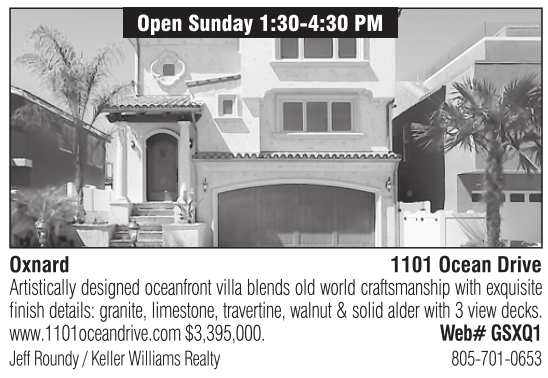 Oxnard 1101 Ocean Drive Artistically designed oceanfront villa blends old world craftsmanship with exquisite finish details: granite, limestone, travertine, walnut & solid alder with 3 view decks. www.1101oceandrive.com $3,395,000. Web# GSXQ1