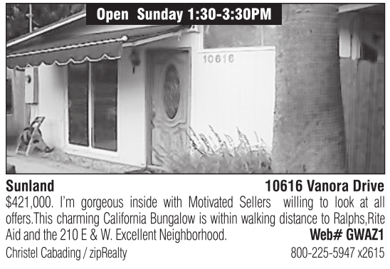 Sunland 10616 Vanora Drive $421,000. I’m gorgeous inside with Motivated Sellers willing to look at all offers.This charming California Bungalow is within walking distance to Ralphs,Rite Aidandthe210E&W.Excellent Neighborhood. Web# GWAZ1