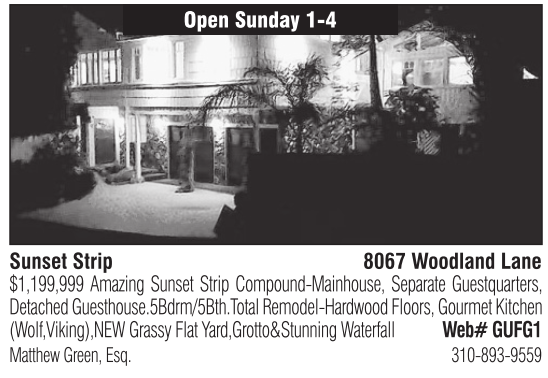 Sunset Strip 8067 Woodland Lane $1,199,999 Amazing Sunset Strip Compound-Mainhouse, Separate Guestquarters, Detached Guesthouse.5Bdrm/5Bth.Total Remodel-Hardwood Floors, Gourmet Kitchen (Wolf,Viking),NEW Grassy Flat Yard,Grotto&Stunning Waterfall Web# GUFG1
