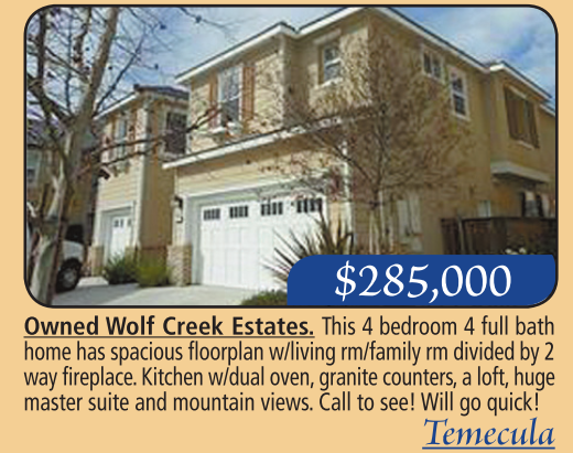 $285,000 Owned Wolf Creek Estates. This 4 bedroom 4 full bath home has spacious floorplan w/living rm/family rm divided by 2 way fireplace. Kitchen w/dual oven, granite counters, a loft, huge master suite and mountain views. Call to see! Will go quick! Temecula