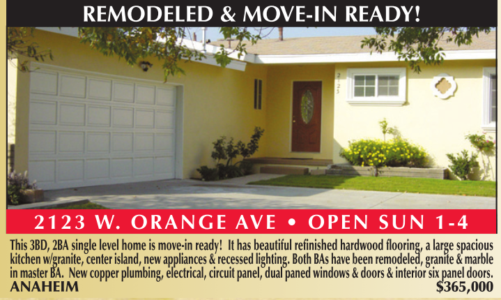 This 3BD, 2BA single level home is move-in ready! It has beautiful refinished hardwood flooring, a large spacious kitchen w/granite, center island, new appliances & recessed lighting. Both BAs have been remodeled, granite & marble in master BA. New copper plumbing, electrical, circuit panel, dual paned windows & doors & interior six panel doors. ANAHEIM $365,000