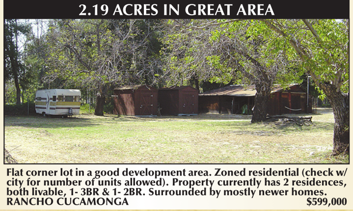 2.19 ACRES IN GREAT AREA Flat corner lot in a good development area. Zoned residential (check w/ city for number of units allowed). Property currently has 2 residences, both livable, 1- 3BR & 1- 2BR. Surrounded by mostly newer homes. RANCHO CUCAMONGA $599,000