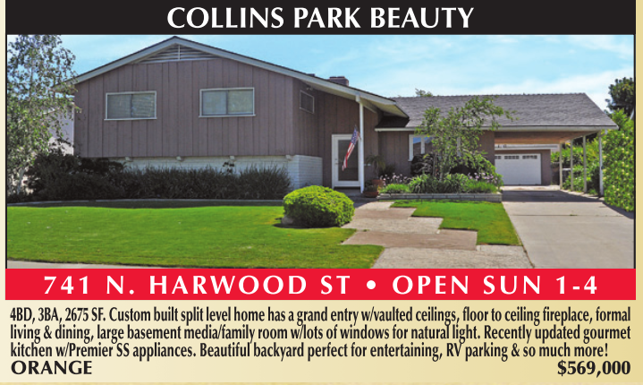 COLLINS PARK BEAUTY 741 N. HARWOOD ST • OPEN SUN 1-4 4BD, 3BA, 2675 SF. Custom built split level home has a grand entry w/vaulted ceilings, floor to ceiling fireplace, formal living & dining, large basement media/family room w/lots of windows for natural light. Recently updated gourmet kitchen w/Premier SS appliances. Beautiful backyard perfect for entertaining, RV parking & so much more! ORANGE $569,000