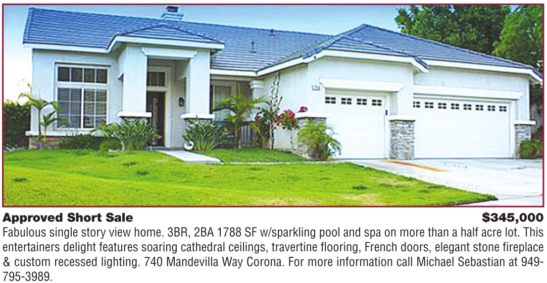 Approved Short Sale $345,000 Fabulous single story view home. 3BR, 2BA 1788 SF w/sparkling pool and spa on more than a half acre lot. This entertainers delight features soaring cathedral ceilings, travertine fl ooring, French doors, elegant stone fi replace & custom recessed lighting. 740 Mandevilla Way Corona. For more information call Michael Sebastian at 949- 795-3989. See also
