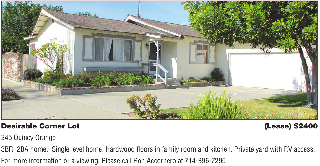 Desirable Corner Lot (Lease) $2400 345 Quincy Orange 3BR, 2BA home. Single level home. Hardwood fl oors in family room and kitchen. Private yard with RV access. For more information or a viewing. Please call Ron Accornero at 714-396-7295