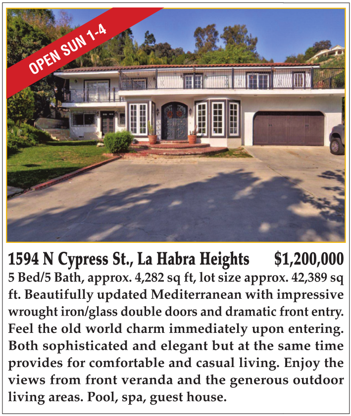 1594 N Cypress St., La Habra Heights $1,200,000 5 Bed/5 Bath, approx. 4,282 sq ft, lot size approx. 42,389 sq ft. Beautifully updated Mediterranean with impressive wrought iron/glass double doors and dramatic front entry. Feel the old world charm immediately upon entering. Both sophisticated and elegant but at the same time provides for comfortable and casual living. Enjoy the views from front veranda and the generous outdoor living areas. Pool, spa, guest house.