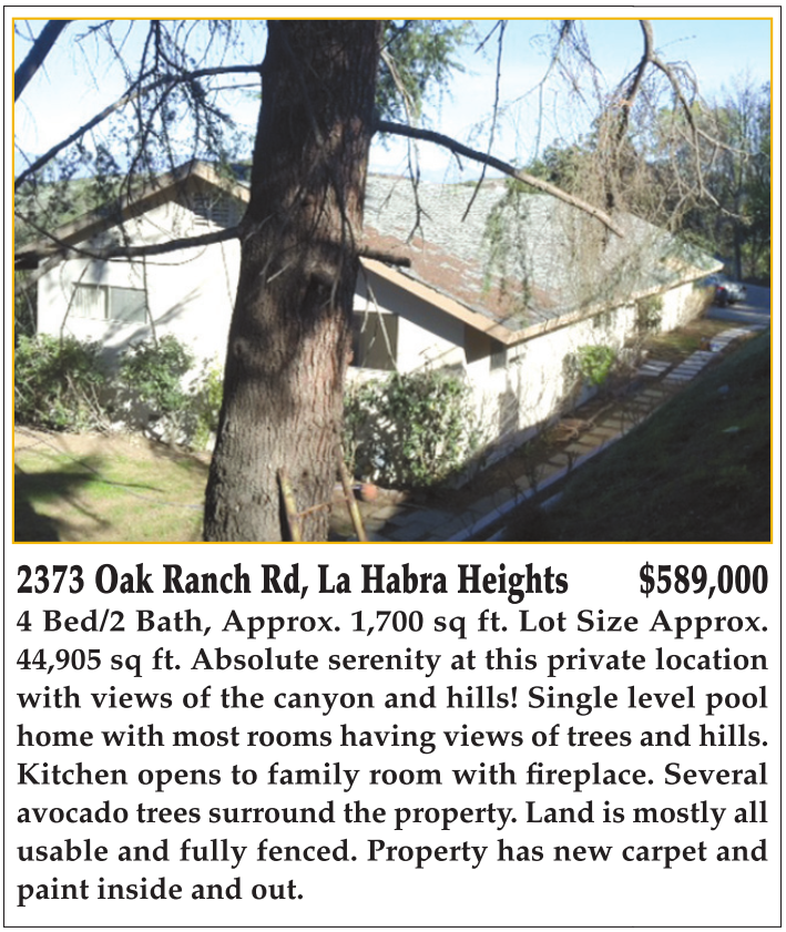 2373 Oak Ranch Rd, La Habra Heights $589,000 4 Bed/2 Bath, Approx. 1,700 sq ft. Lot Size Approx. 44,905 sq ft. Absolute serenity at this private location with views of the canyon and hills! Single level pool home with most rooms having views of trees and hills. Kitchen opens to family room with fireplace. Several avocado trees surround the property. Land is mostly all usable and fully fenced. Property has new carpet and paint inside and out.