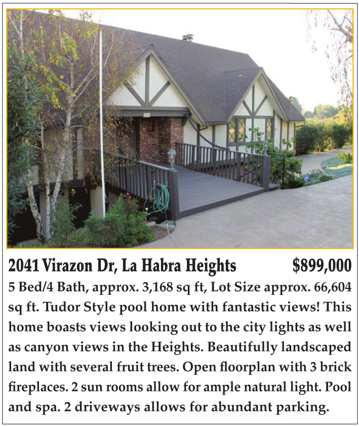 2041 Virazon Dr, La Habra Heights $899,000 5 Bed/4 Bath, approx. 3,168 sq ft, Lot Size approx. 66,604 sq ft. Tudor Style pool home with fantastic views! This home boasts views looking out to the city lights as well as canyon views in the Heights. Beautifully landscaped land with several fruit trees. Open floorplan with 3 brick fireplaces. 2 sun rooms allow for ample natural light. Pool and spa. 2 driveways allows for abundant parking.
