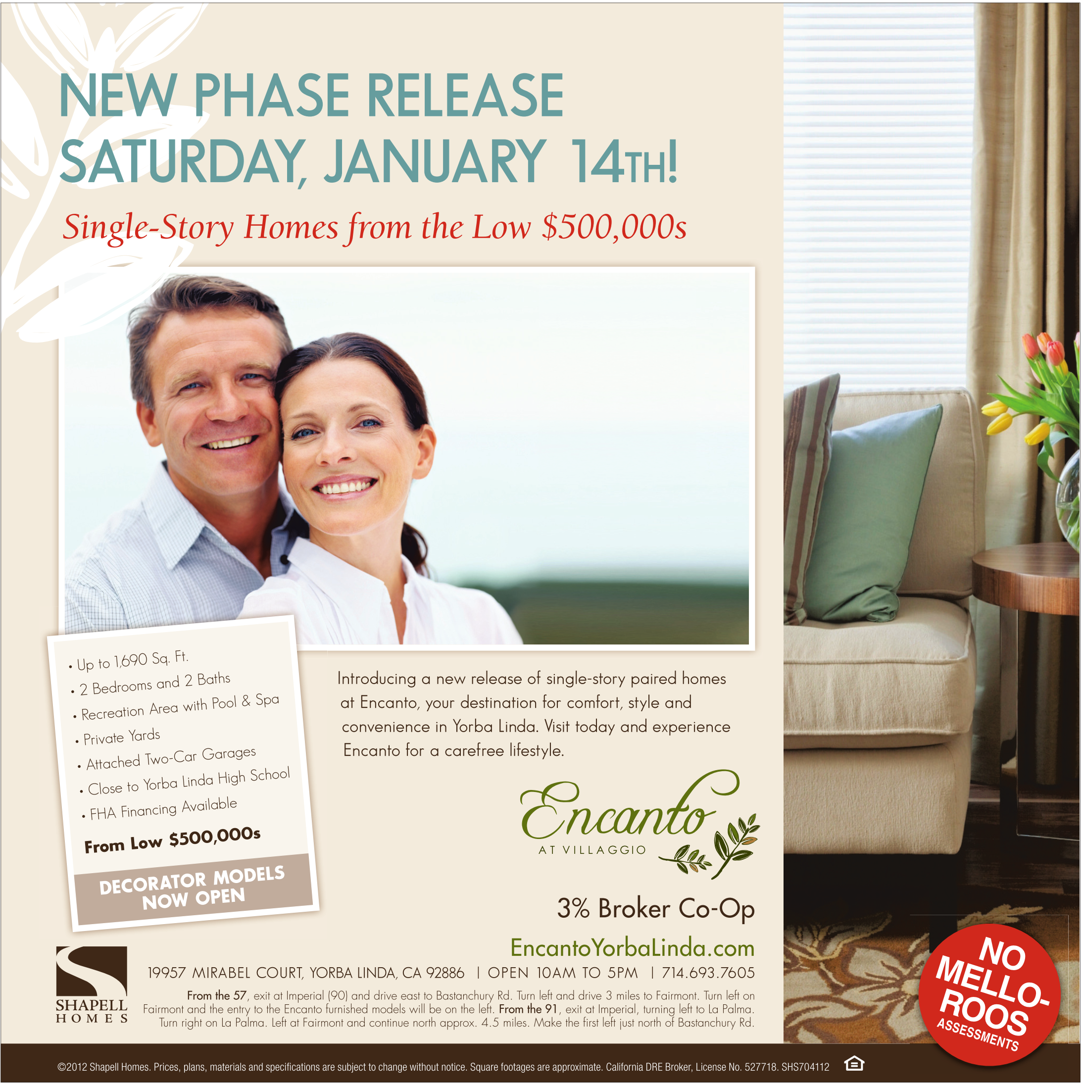 NEW PHASE RELEASE SATURDAY, JANUARY 14TH! Single-Story Homes from the Low $500,000s Introducing a new release of single-story paired homes at Encanto, your destination for comfort, style and convenience in Yorba Linda. Visit today and experience Encanto for a carefree lifestyle. 3% Broker Co-Op EncantoYorbaLinda.com 19957 MIRABEL COURT, YORBA LINDA, CA 92886 | OPEN 10AM TO 5PM | 714.693.7605 From the 57, exit at Imperial (90) and drive east to Bastanchury Rd. Turn left and drive 3 miles to Fairmont. Turn left on Fairmont and the entry to the Encanto furnished models will be on the left. From the 91, exit at Imperial, turning left to La Palma. Turn right on La Palma. Left at Fairmont and continue north approx. 4.5 miles. Make the first left just north of Bastanchury Rd. ©2012 Shapell Homes. Prices, plans, materials and specifications are subject to change without notice. Square footages are approximate. California DRE Broker, License No. 527718. SHS704112