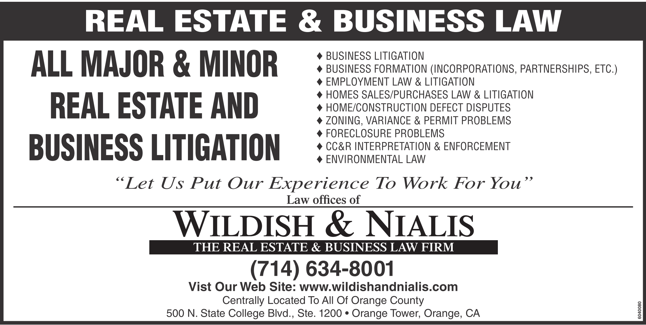 EMPLOYMENT LAW & LITIGATION HOMES SALES/PURCHASES LAW & LITIGATION HOME/CONSTRUCTION DEFECT DISPUTES ZONING, VARIANCE & PERMIT PROBLEMS FORECLOSURE PROBLEMS CC&R INTERPRETATION & ENFORCEMENT ENVIRONMENTAL LAW