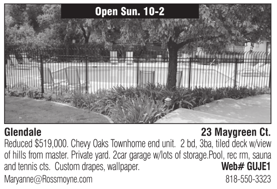 Glendale 23 Maygreen Ct. Reduced $519,000. Chevy Oaks Townhome end unit. 2 bd, 3ba, tiled deck w/view of hills from master. Private yard. 2car garage w/lots of storage.Pool, rec rm, sauna and tennis cts. Custom drapes, wallpaper. Web# GUJE1 Open Sun. 10-2 Maryanne@Rossmoyne.com 818-550-3323