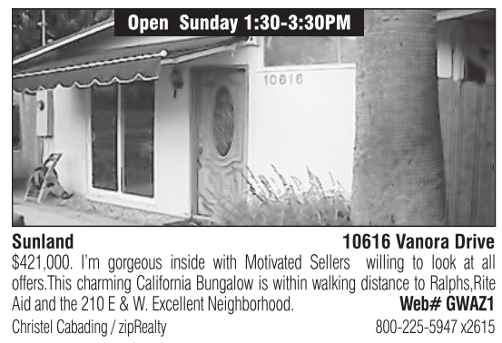 Open Sunday 1:30-3:30PM Sunland 10616 Vanora Drive $421,000. I’m gorgeous inside with Motivated Sellers willing to look at all offers.This charming California Bungalow is within walking distance to Ralphs,Rite Aidandthe210E&W.Excellent Neighborhood. Web# GWAZ1 Christel Cabading / zipRealty 800-225-5947 x2615