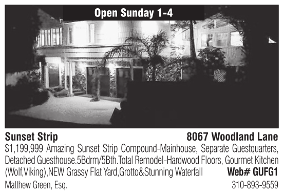 Open Sunday 1-4 Sunset Strip 8067 Woodland Lane $1,199,999 Amazing Sunset Strip Compound-Mainhouse, Separate Guestquarters, Detached Guesthouse.5Bdrm/5Bth.Total Remodel-Hardwood Floors, Gourmet Kitchen (Wolf,Viking),NEW Grassy Flat Yard,Grotto&Stunning Waterfall Web# GUFG1 Matthew Green, Esq. 310-893-9559 See also
