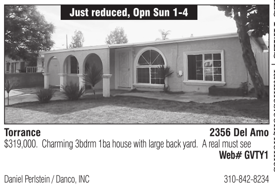Torrance 2356 Del Amo $319,000. Charming 3bdrm 1ba house with large back yard. A real must see Web# GVTY1 Daniel Perlstein / Danco, INC 310-842-8234