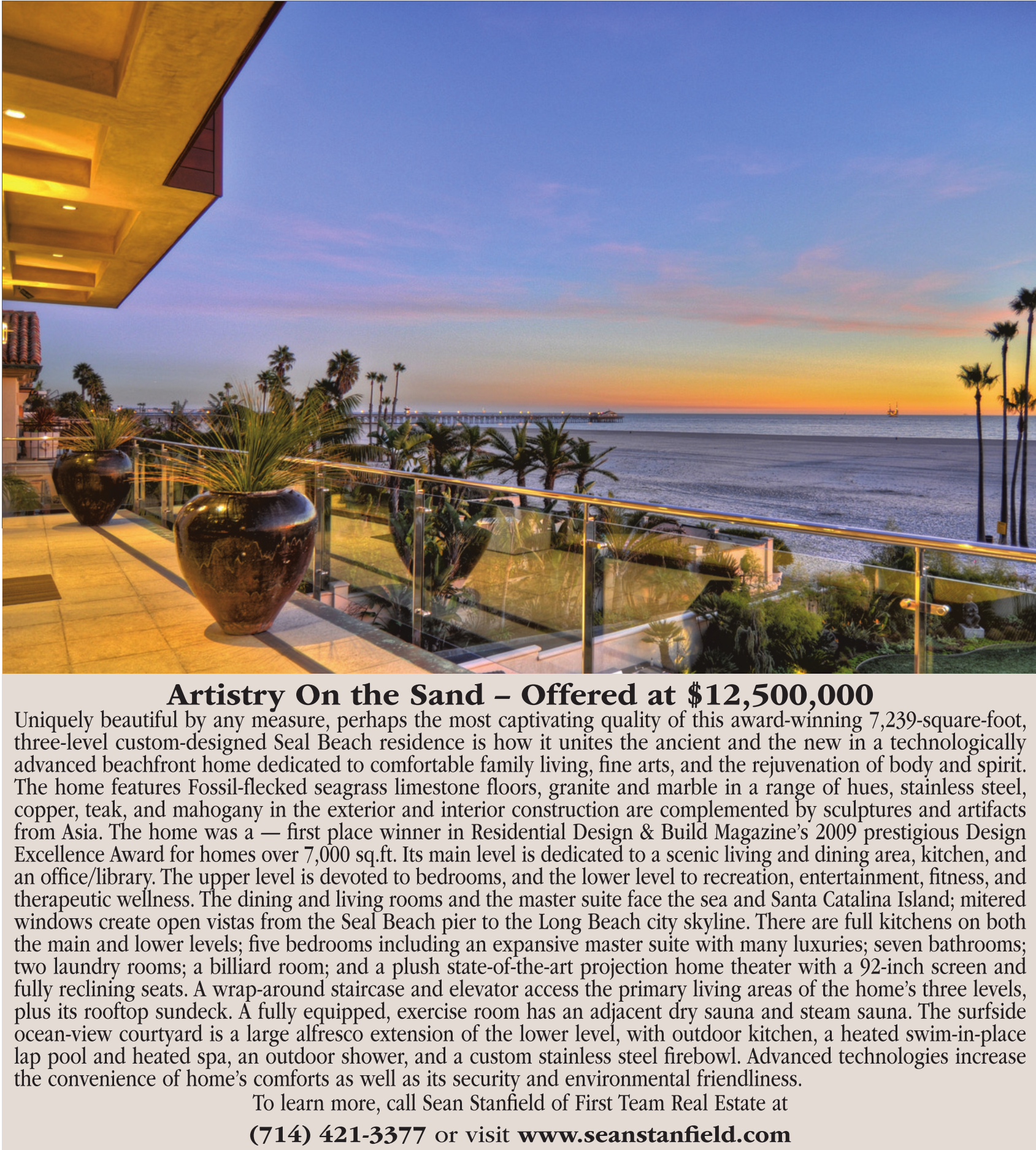 Uniquely beautiful by any measure, perhaps the most captivating quality of this award-winning 7,239-square-foot, three-level custom-designed Seal Beach residence is how it unites the ancient and the new in a technologically advanced beachfront home dedicated to comfortable family living, fine arts, and the rejuvenation of body and spirit. The home features Fossil-flecked seagrass limestone floors, granite and marble in a range of hues, stainless steel, copper, teak, and mahogany in the exterior and interior construction are complemented by sculptures and artifacts from Asia. The home was a — first place winner in Residential Design & Build Magazine’s 2009 prestigious Design Excellence Award for homes over 7,000 sq.ft. Its main level is dedicated to a scenic living and dining area, kitchen, and an office/library. The upper level is devoted to bedrooms, and the lower level to recreation, entertainment, fitness, and therapeutic wellness. The dining and living rooms and the master suite face the sea and Santa Catalina Island; mitered windows create open vistas from the Seal Beach pier to the Long Beach city skyline. There are full kitchens on both the main and lower levels; five bedrooms including an expansive master suite with many luxuries; seven bathrooms; two laundry rooms; a billiard room; and a plush state-of-the-art projection home theater with a 92-inch screen and fully reclining seats. A wrap-around staircase and elevator access the primary living areas of the home’s three levels, plus its rooftop sundeck. A fully equipped, exercise room has an adjacent dry sauna and steam sauna. The surfside ocean-view courtyard is a large alfresco extension of the lower level, with outdoor kitchen, a heated swim-in-place lap pool and heated spa, an outdoor shower, and a custom stainless steel firebowl. Advanced technologies increase the convenience of home’s comforts as well as its security and environmental friendliness.