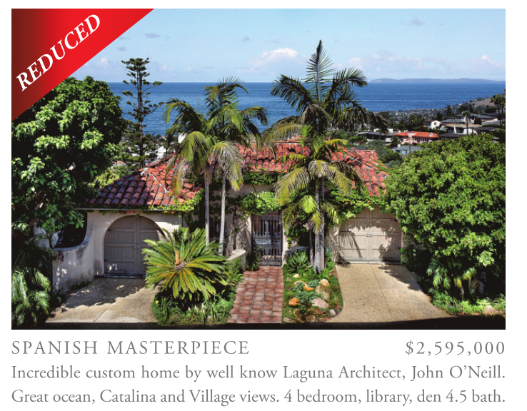 SPANISH MASTERPIECE $2,595,000 Incredible custom home by well know Laguna Architect, John O’Neill. Great ocean, Catalina and Village views. 4 bedroom, library, den 4.5 bath.
