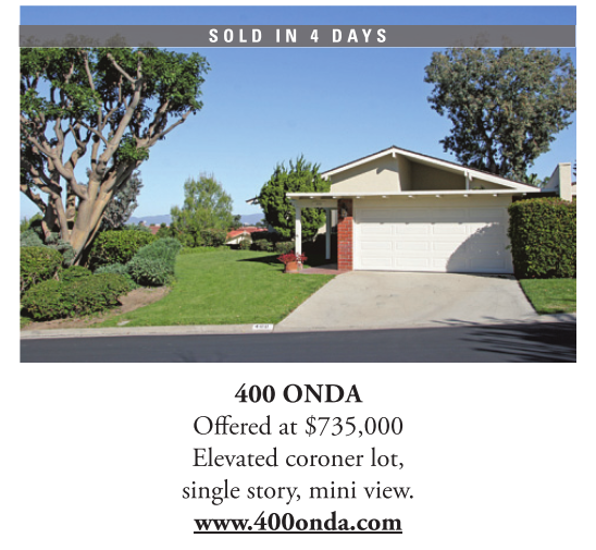 400 ONDA Offered at $735,000 Elevated coroner lot, single story, mini view.