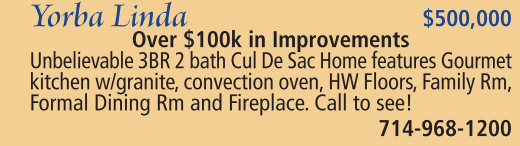 Yorba Linda $500,000 Over $100k in Improvements Unbelievable 3BR 2 bath Cul De Sac Home features Gourmet kitchen w/granite, convection oven, HW Floors, Family Rm, Formal Dining Rm and Fireplace. Call to see!