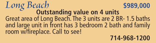 Great area of Long Beach. The 3 units are 2 BR- 1.5 baths and large unit in front has 3 bedroom 2 bath and family room w/fireplace. Call to see!
