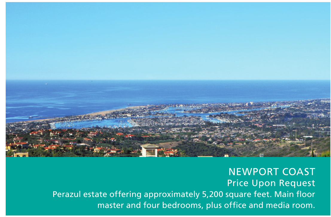 NEWPORT COAST Price Upon Request Perazul estate offering approximately 5,200 square feet. Main floor master and four bedrooms, plus office and media room.
