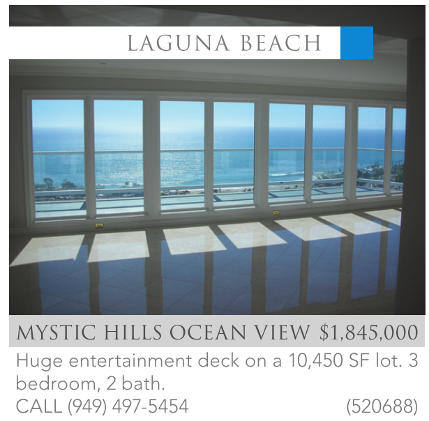 MYSTIC HILLS OCEAN VIEW $1,845,000 Huge entertainment deck on a 10,450 SF lot. 3 bedroom, 2 bath. CALL (949) 497-5454 (520688)