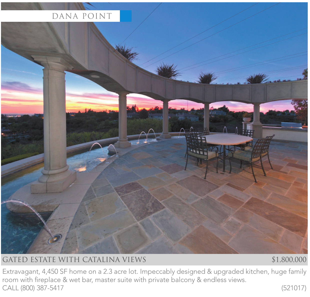 GATED ESTATE WITH CATALINA VIEWS $1,800,000 Extravagant, 4,450 SF home on a 2.3 acre lot. Impeccably designed & upgraded kitchen, huge family room with fireplace & wet bar, master suite with private balcony & endless views. CALL (800) 387-5417 (521017)