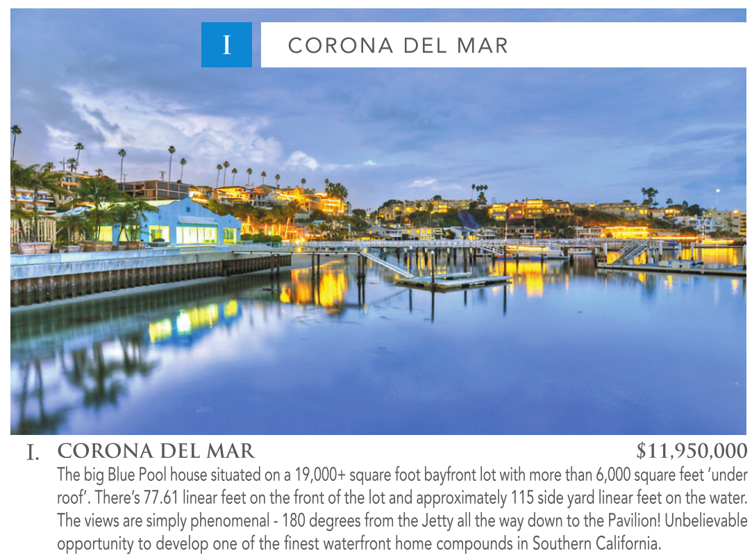 CORONA DEL MAR $11,950,000 The big Blue Pool house situated on a 19,000+ square foot bayfront lot with more than 6,000 square feet ‘under roof’. There’s 77.61 linear feet on the front of the lot and approximately 115 side yard linear feet on the water. The views are simply phenomenal - 180 degrees from the Jetty all the way down to the Pavilion! Unbelievable opportunity to develop one of the finest waterfront home compounds in Southern California.