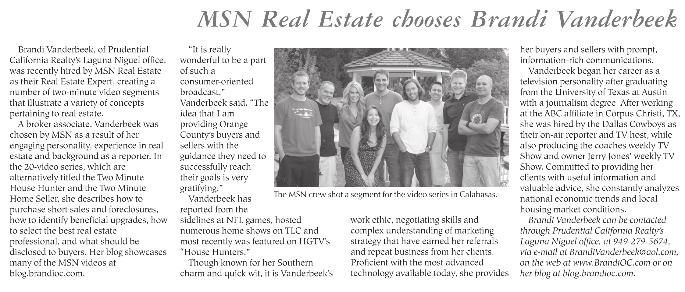 Brandi Vanderbeek, of Prudential California Realty’s Laguna Niguel office, was recently hired by MSN Real Estate as their Real Estate Expert, creating a number of two-minute video segments that illustrate a variety of concepts pertaining to real estate.