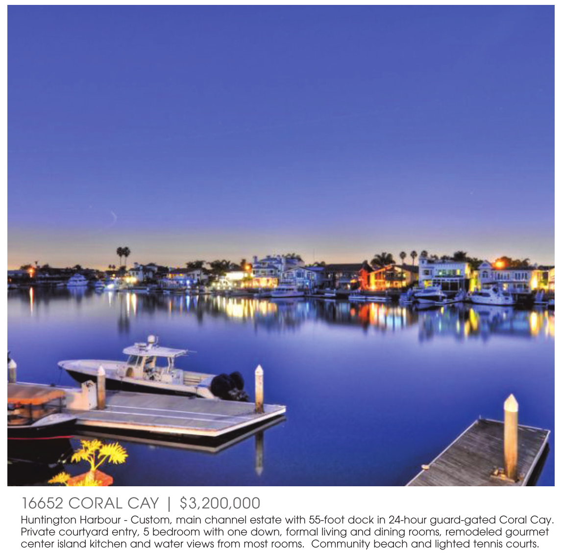 Huntington Harbour - Custom, main channel estate with 55-foot dock in 24-hour guard-gated Coral Cay. Private courtyard entry, 5 bedroom with one down, formal living and dining rooms, remodeled gourmet center island kitchen and water views from most rooms. Community beach and lighted tennis courts.