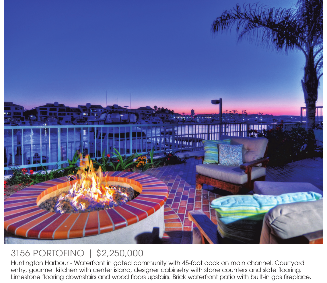 3156 PORTOFINO | $2,250,000 Huntington Harbour - Waterfront in gated community with 45-foot dock on main channel. Courtyard entry, gourmet kitchen with center island, designer cabinetry with stone counters and slate flooring. Limestone flooring downstairs and wood floors upstairs. Brick waterfront patio with built-in gas fireplace.