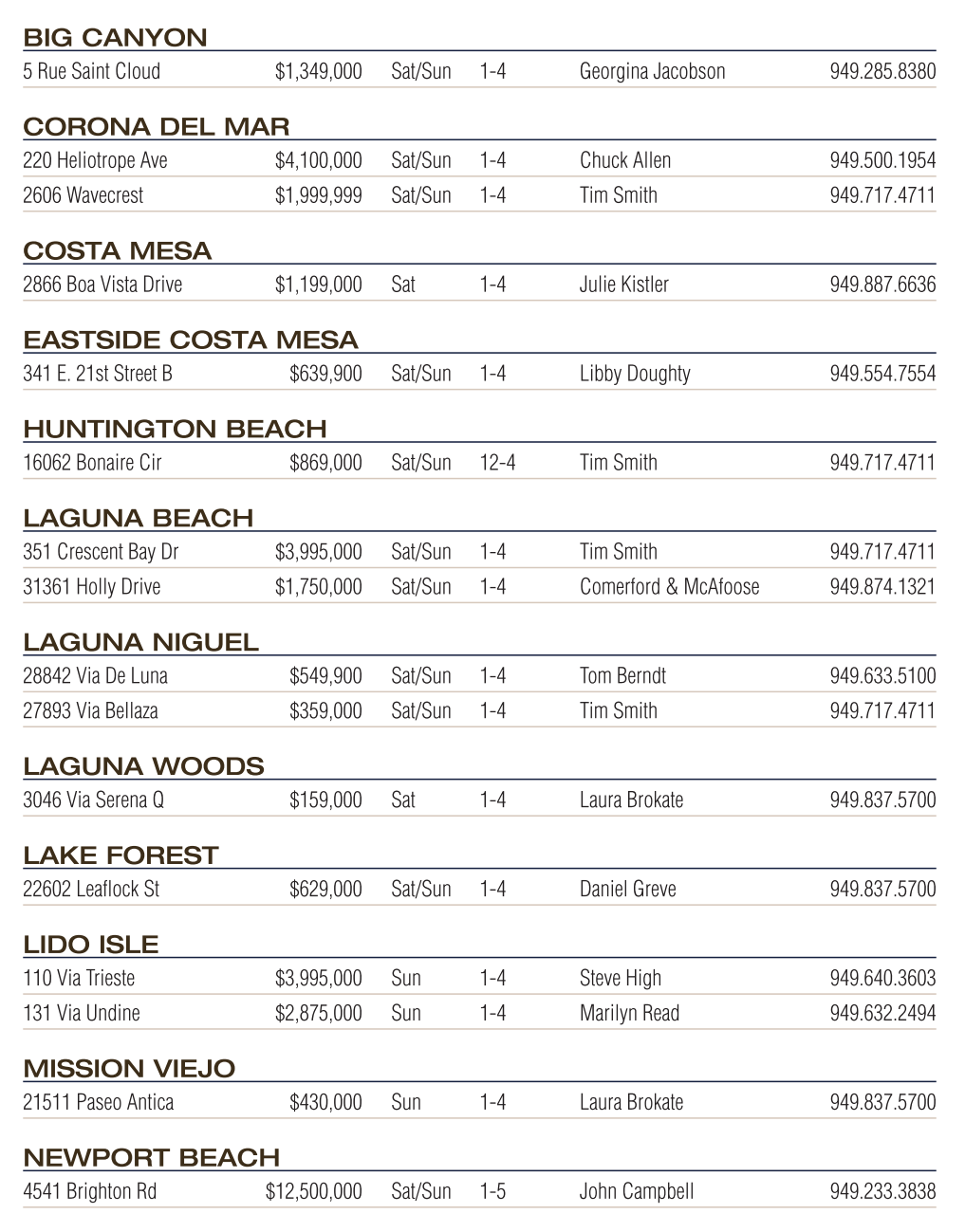 BIG CANYON 5 Rue Saint Cloud $1,349,000 Sat/Sun 1-4 Georgina Jacobson 949.285.8380 CORONA DEL MAR 220 Heliotrope Ave $4,100,000 Sat/Sun 1-4 Chuck Allen 949.500.1954 2606 Wavecrest $1,999,999 Sat/Sun 1-4 Tim Smith 949.717.4711 COSTA MESA 2866 Boa Vista Drive $1,199,000 Sat 1-4 Julie Kistler 949.887.6636 EASTSIDE COSTA MESA 341 E. 21st Street B $639,900 Sat/Sun 1-4 Libby Doughty 949.554.7554 HUNTINGTON BEACH 16062 Bonaire Cir $869,000 Sat/Sun 12-4 Tim Smith 949.717.4711 LAGUNA BEACH 351 Crescent Bay Dr $3,995,000 Sat/Sun 1-4 Tim Smith 949.717.4711 31361 Holly Drive $1,750,000 Sat/Sun 1-4 Comerford & McAfoose 949.874.1321 LAGUNA NIGUEL 28842 Via De Luna $549,900 Sat/Sun 1-4 Tom Berndt 949.633.5100 27893 Via Bellaza $359,000 Sat/Sun 1-4 Tim Smith 949.717.4711 LAGUNA WOODS 3046 Via Serena Q $159,000 Sat 1-4 Laura Brokate 949.837.5700 LAKE FOREST 22602 Leaflock St $629,000 Sat/Sun 1-4 Daniel Greve 949.837.5700 LIDO ISLE 110 Via Trieste $3,995,000 Sun 1-4 Steve High 949.640.3603 131 Via Undine $2,875,000 Sun 1-4 Marilyn Read 949.632.2494 MISSION VIEJO 21511 Paseo Antica $430,000 Sun 1-4 Laura Brokate 949.837.5700 NEWPORT BEACH 4541 Brighton Rd $12,500,000 Sat/Sun 1-5 John Campbell 949.233.3838