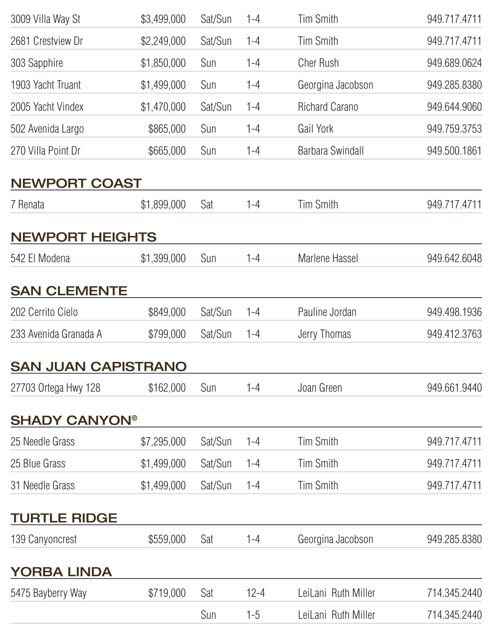 3009 Villa Way St $3,499,000 Sat/Sun 1-4 Tim Smith 949.717.4711 2681 Crestview Dr $2,249,000 Sat/Sun 1-4 Tim Smith 949.717.4711 303 Sapphire $1,850,000 Sun 1-4 Cher Rush 949.689.0624 1903 Yacht Truant $1,499,000 Sun 1-4 Georgina Jacobson 949.285.8380 2005 Yacht Vindex $1,470,000 Sat/Sun 1-4 Richard Carano 949.644.9060 502 Avenida Largo $865,000 Sun 1-4 Gail York 949.759.3753 270 Villa Point Dr $665,000 Sun 1-4 Barbara Swindall 949.500.1861