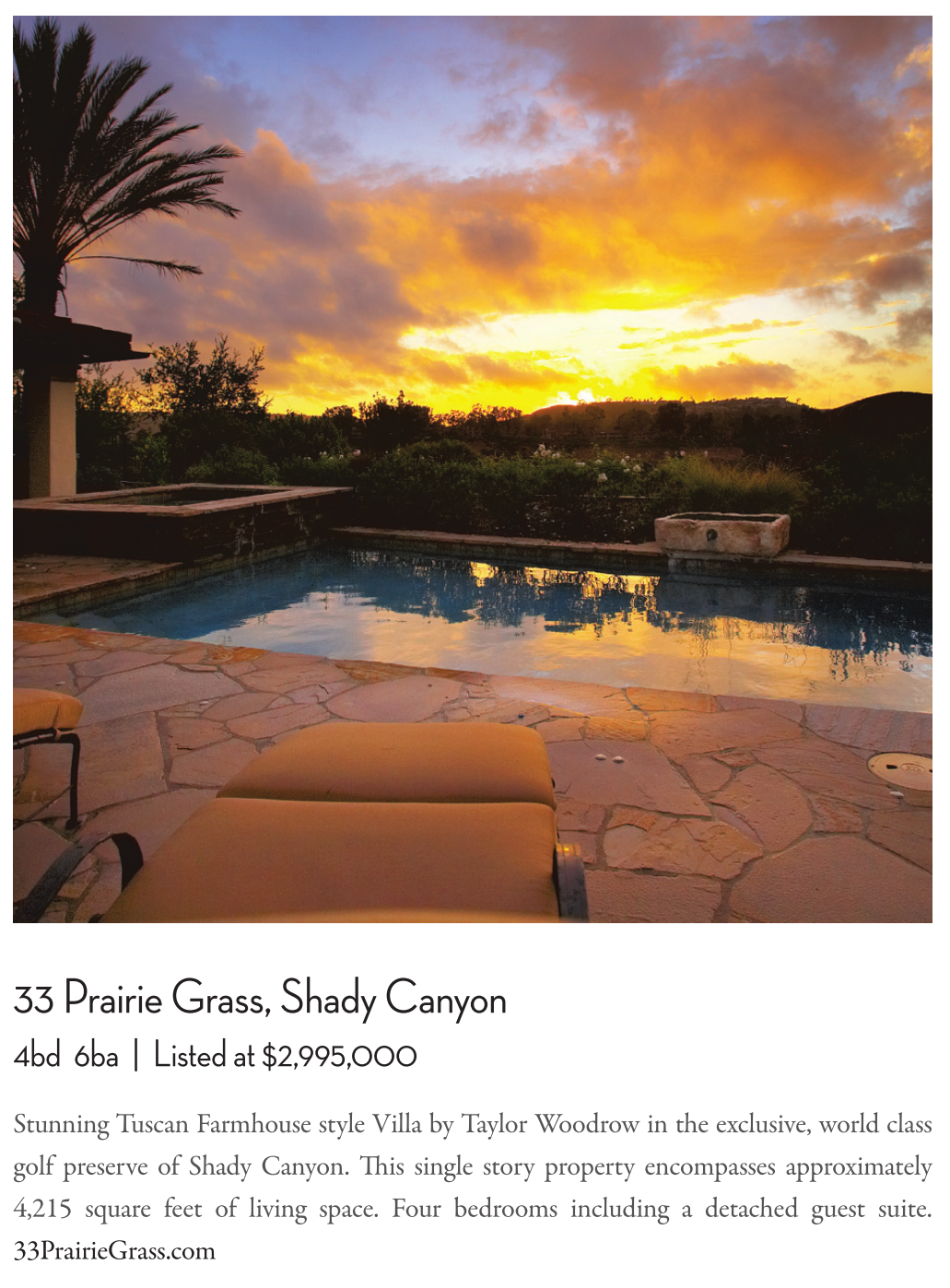 Stunning Tuscan Farmhouse style Villa by Taylor Woodrow in the exclusive, world class golf preserve of Shady Canyon. This single story property encompasses approximately 4,215 square feet of living space. Four bedrooms including a detached guest suite. 33PrairieGrass.com