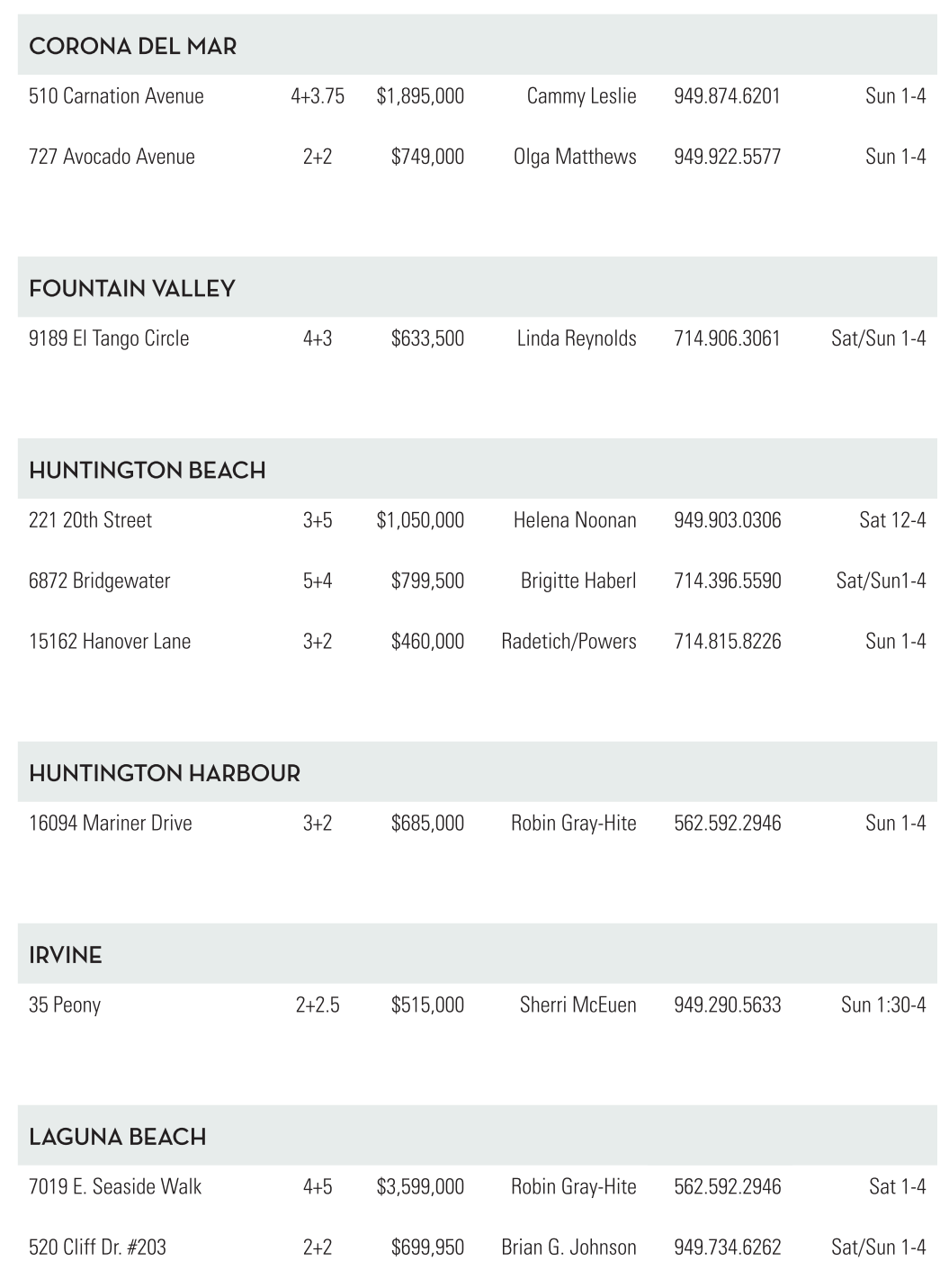 510 Carnation Avenue 4+3.75 $1,895,000 Cammy Leslie 949.874.6201 Sun 1-4