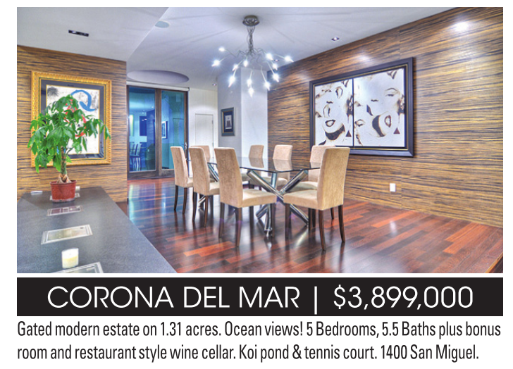 Gated modern estate on 1.31 acres. Ocean views! 5 Bedrooms, 5.5 Baths plus bonus room and restaurant style wine cellar. Koi pond & tennis court. 1400 San Miguel.