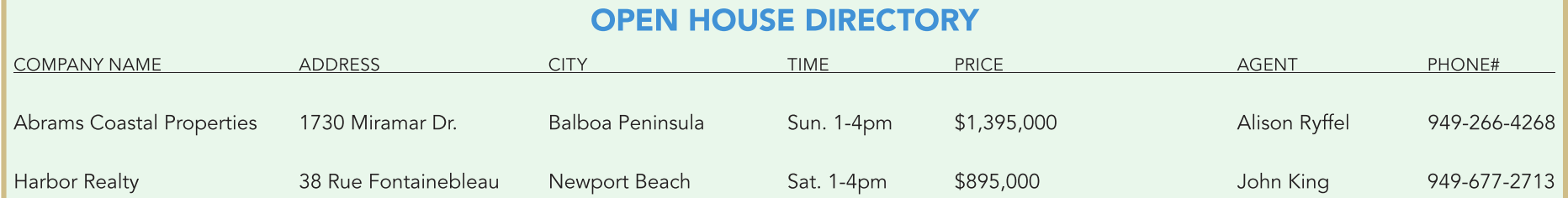 OPEN HOUSE DIRECTORY COMPANY NAME ADDRESS CITY TIME PRICE AGENT PHONE# Abrams Coastal Properties 1730 Miramar Dr. Balboa Peninsula Sun. 1-4pm $1,395,000 Alison Ryffel 949-266-4268 Harbor Realty 38 Rue Fontainebleau Newport Beach Sat. 1-4pm $895,000 John King 949-677-2713