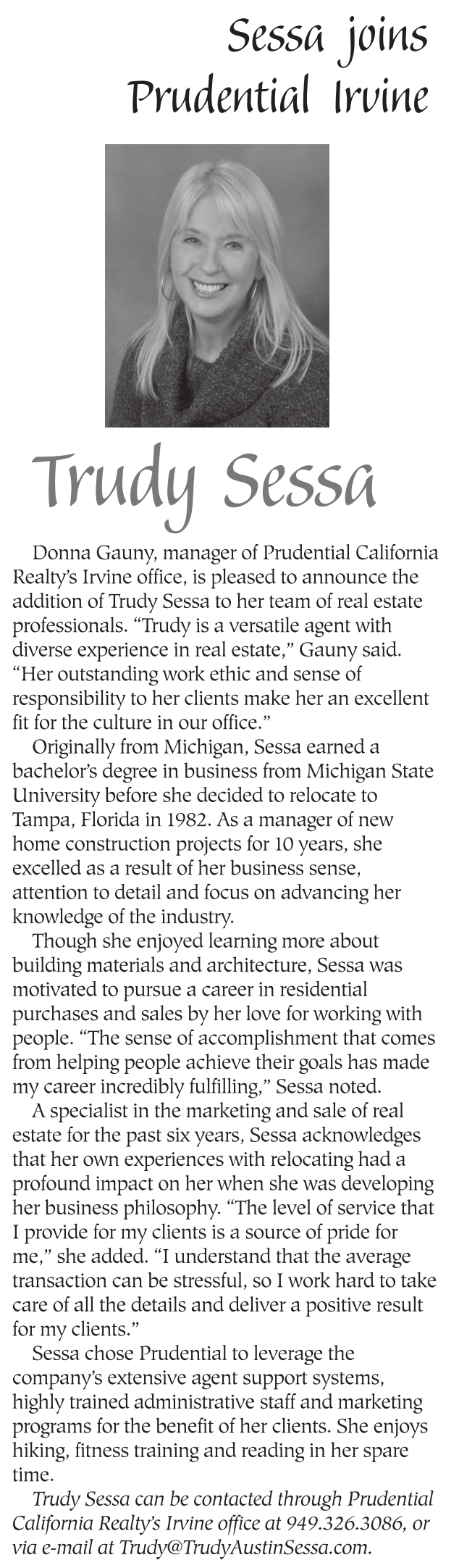 Sessa joins Prudential Irvine Trudy Sessa Donna Gauny, manager of Prudential California Realty’s Irvine office, is pleased to announce the addition of Trudy Sessa to her team of real estate professionals. “Trudy is a versatile agent with diverse experience in real estate,” Gauny said. “Her outstanding work ethic and sense of responsibility to her clients make her an excellent fit for the culture in our office.” Originally from Michigan, Sessa earned a bachelor’s degree in business from Michigan State University before she decided to relocate to Tampa, Florida in 1982. As a manager of new home construction projects for 10 years, she excelled as a result of her business sense, attention to detail and focus on advancing her knowledge of the industry. Though she enjoyed learning more about building materials and architecture, Sessa was motivated to pursue a career in residential purchases and sales by her love for working with people. “The sense of accomplishment that comes from helping people achieve their goals has made my career incredibly fulfilling,” Sessa noted. A specialist in the marketing and sale of real estate for the past six years, Sessa acknowledges that her own experiences with relocating had a profound impact on her when she was developing her business philosophy. “The level of service that I provide for my clients is a source of pride for me,” she added. “I understand that the average transaction can be stressful, so I work hard to take care of all the details and deliver a positive result for my clients.” Sessa chose Prudential to leverage the company’s extensive agent support systems, highly trained administrative staff and marketing programs for the benefit of her clients. She enjoys hiking, fitness training and reading in her spare time. Trudy Sessa can be contacted through Prudential California Realty’s Irvine office at 949.326.3086, or via e-mail at Trudy@TrudyAustinSessa.com.