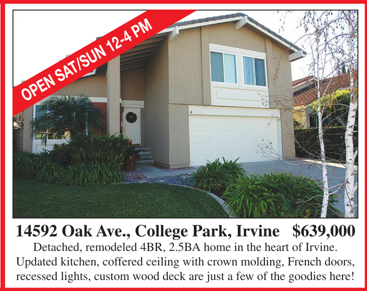 14592 Oak Ave., College Park, Irvine $639,000 Detached, remodeled 4BR, 2.5BA home in the heart of Irvine.