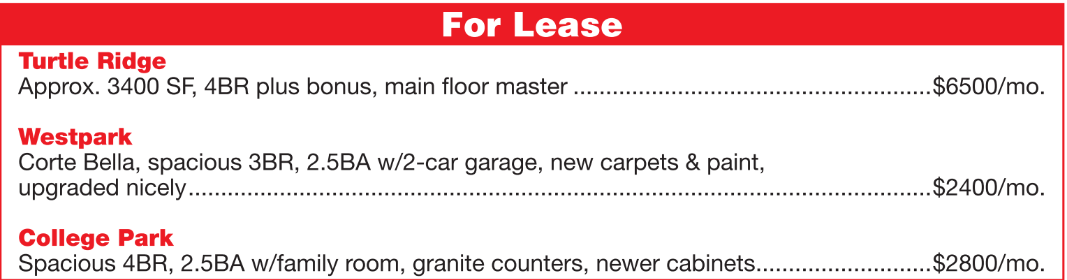 Turtle Ridge Approx. 3400 SF, 4BR plus bonus, main floor master .......................................................$6500/mo.