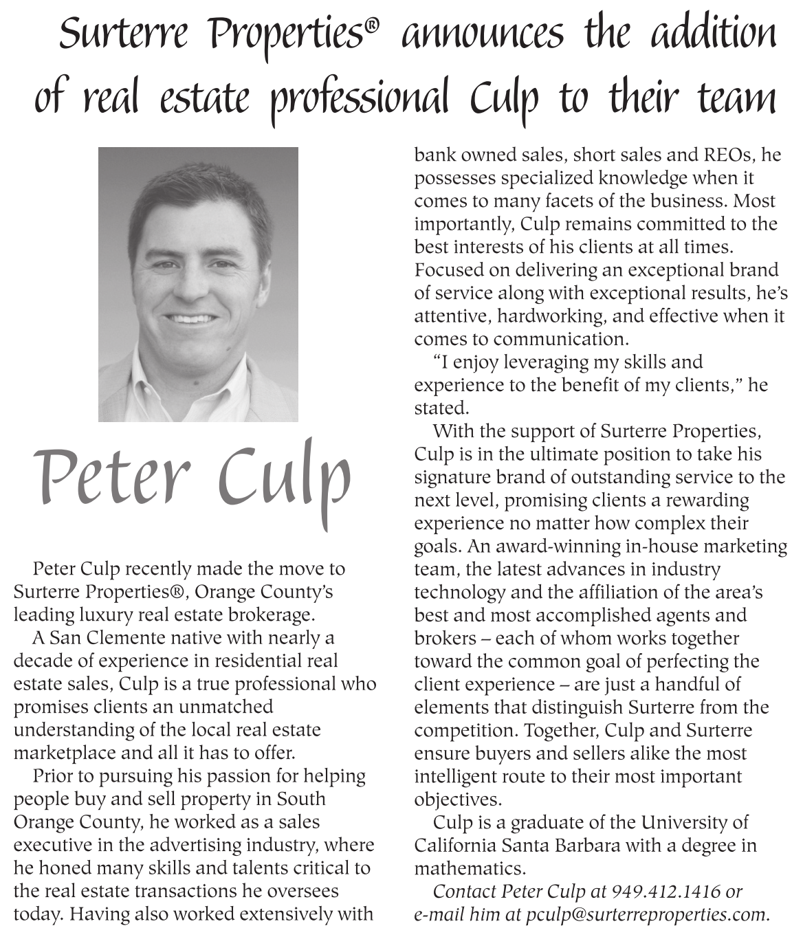 Contact Peter Culp at 949.412.1416 or e-mail him at pculp@surterreproperties.com.